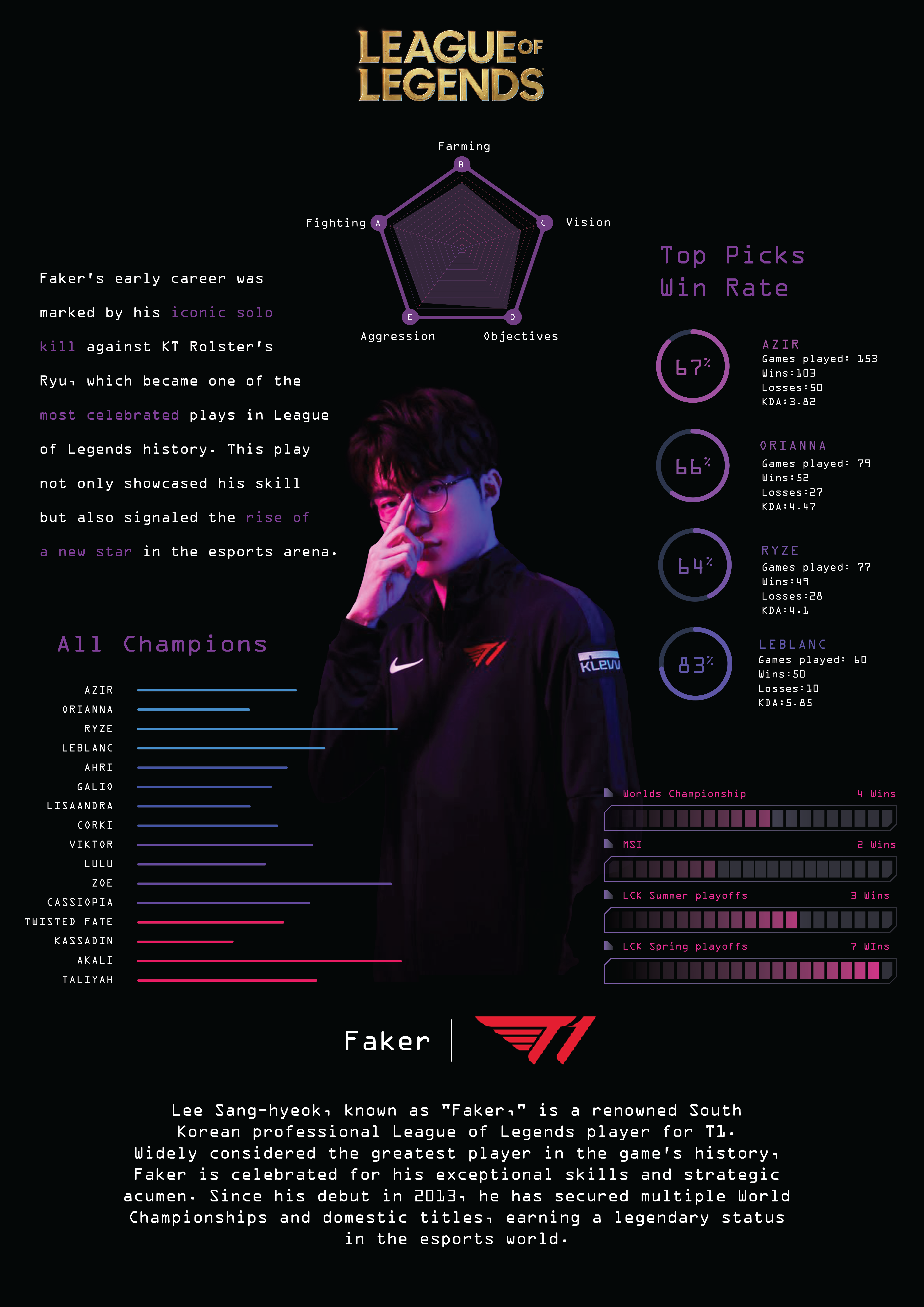 Creating a data visualization for a player like Faker offers numerous benefits, particularly in understanding and appreciating his impact on the world of esports. Data visualization transforms complex statistics and performance metrics into a more accessible and engaging format, making it easier for fans, analysts, and fellow players to grasp the extent of Faker's achievements. By visually representing his win rates, champion preferences, and performance trends over time, we can gain insights into his playstyle, adaptability, and evolution as a player. This not only celebrates his career but also provides valuable lessons in strategy and skill development for those looking to learn from the best. Additionally, such visualizations can enhance storytelling in esports journalism and broadcasting, offering a richer narrative about Faker's journey and contributions to League of Legends. In essence, data visualization brings to life the numbers behind the legend, offering a clearer picture of why Faker is considered one of the greatest in the game.
