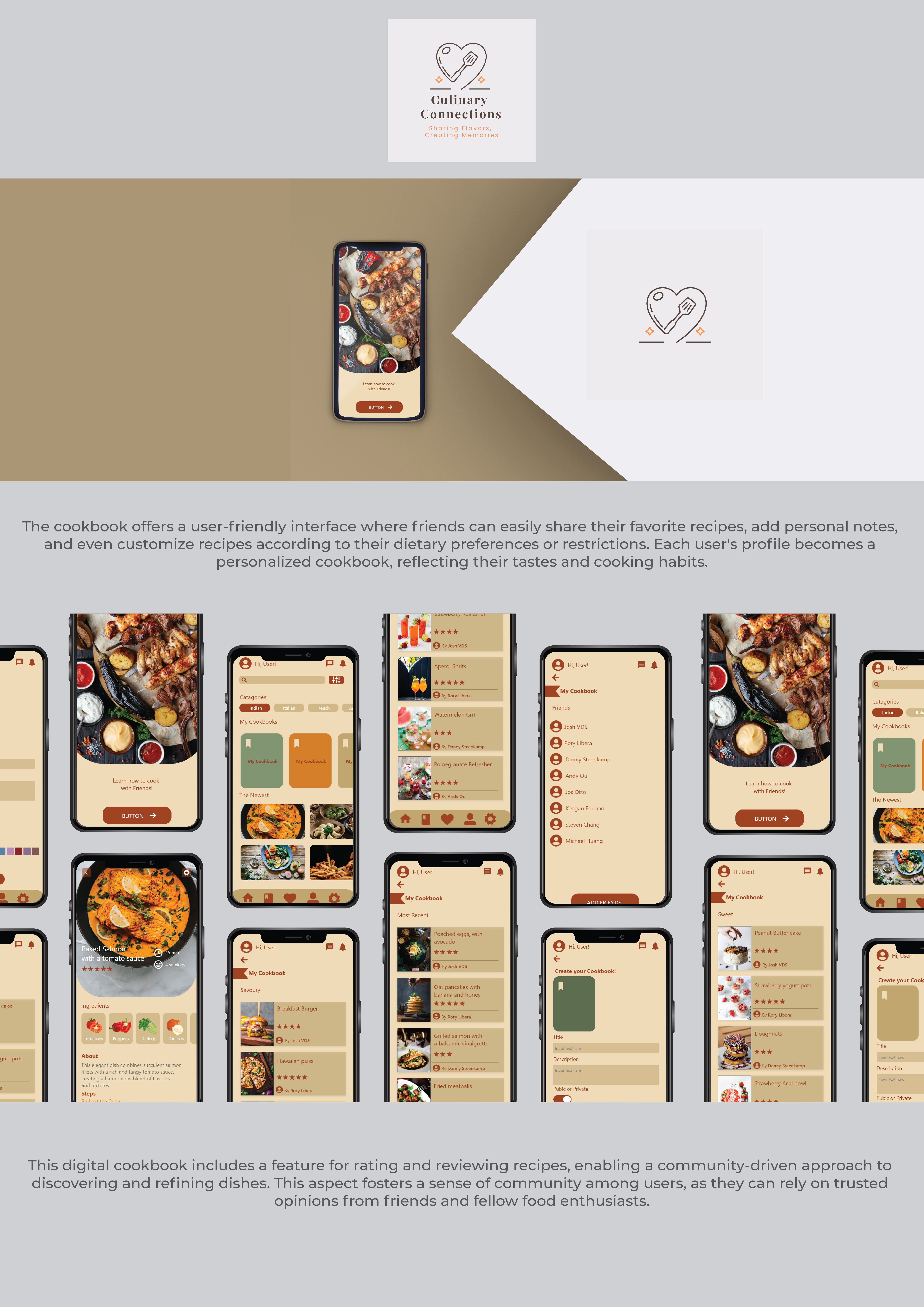 The cookbook offers a user-friendly interface where friends can easily share their favorite recipes, add personal notes, and even customize recipes according to their dietary preferences or restrictions. Each user's profile becomes a personalized cookbook, reflecting their tastes and cooking habits.
