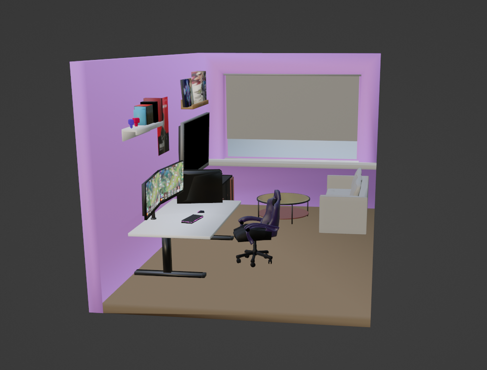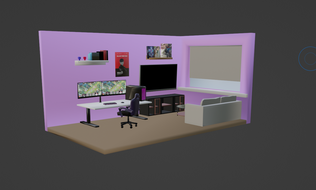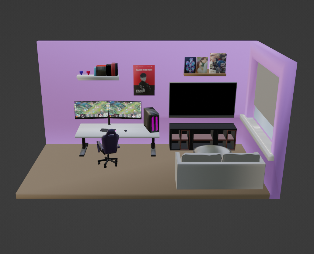 The 3D model of the gaming room is a meticulously crafted digital space that exudes a modern, high-tech ambiance, tailor-made for gaming enthusiasts. As you enter the virtual room, your eyes are immediately drawn to the centerpiece: a sleek, ergonomic gaming chair positioned in front of a state-of-the-art gaming setup. The setup includes an ultra-wide curved monitor that promises an immersive gaming experience, flanked by high-fidelity speakers that accentuate the room's focus on audio-visual excellence.